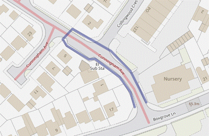 See below for a map for the extents of our works – works will be carried out on Cunningham Avenue from junction with Boxgrove Road to number 5 and on the opposite side of the road from outside nursery to number 2.